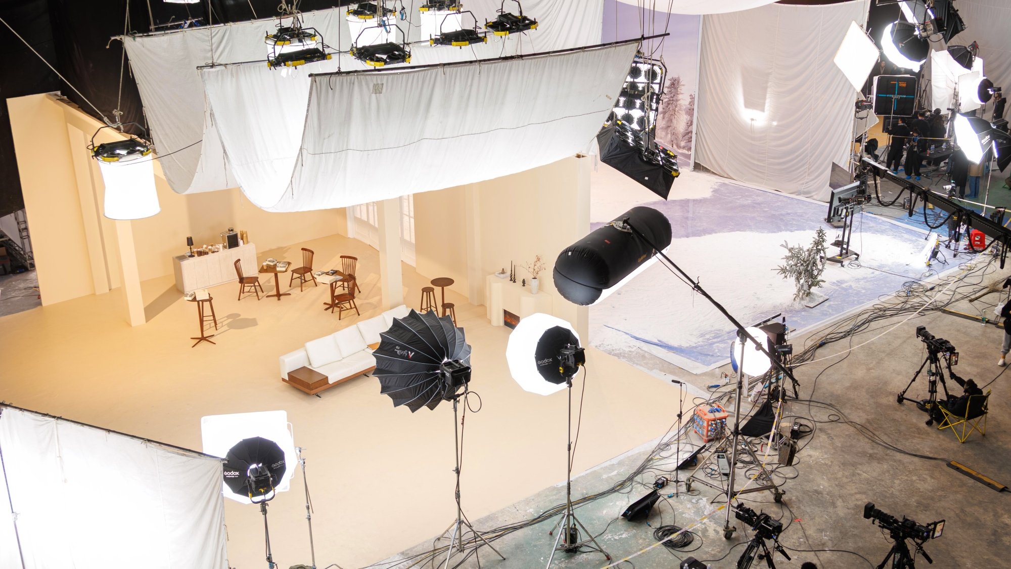 胡可直播间在2000平场地内搭建三大特色场景,覆盖咖啡厅、室外雪景、居家空间