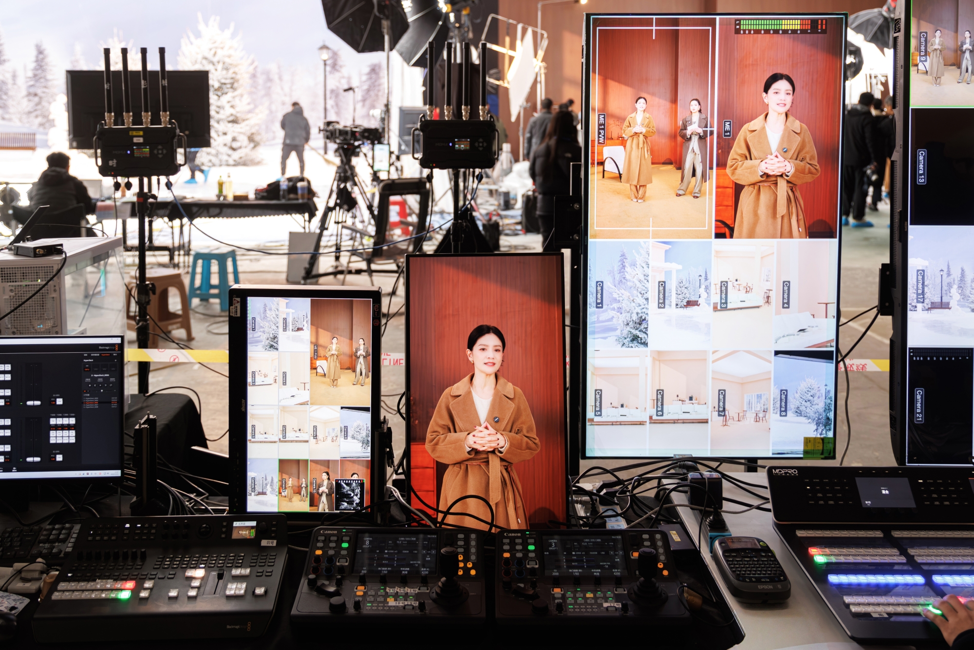 在资源配置上,将讯道系统集中用于开场秀、中场秀等对画质与机动性要求更高的环节,同时以轻量化设备覆盖标准化电商带货场景,在专业效果与成本控制之间实现了有效平衡。机位部署上,走秀环节由9机位组成,覆盖咖啡厅、室外雪景等分场景,结合远程控制系统,精准捕捉明星主播、模特的动态走秀与互动;产品讲解环节,则采用5台佳能EOS C80,实现场景的全方位覆盖,确保穿搭展示与面料细节的高品质呈现。在视觉呈现方面,得益于佳能色彩科学,保障了全流程、多机位视觉呈现的一致性。在工作流程设计上,根据不同环节量身定制技术方案——秀场环节侧重电影级表达,采用讯道系统,集合佳能镜头原厂生态优势以及广电系统无缝集成,支持复杂运镜,产品讲解环节则以效率为先,轻量化系统在保证画质的同时提升执行敏捷性。