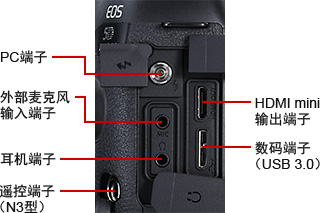 EOS 5D Mark IV支持多种系统下的静止图像和短片拍摄,为用户提供多种输入输出端子。除了用于和影棚闪光灯同步的PC端子和遥控端子(佳能N3型)外,还有支持USB 3.0的数码端子。通过USB 3.0端子能高速传输所拍图像。短片拍摄时通过外部麦克风输入端子可外接立体声麦克风(3.5毫米微型插孔),由此便可进行双声道录音。另外还配备了耳机端子,可连接3.5毫米微型插孔的立体声耳机,监听录音中的情况。HDMI mini端子除了可以将实时显示画面输出至外部监视器或将所拍图像、短片输出至大画面电视等,还能在业务用影像制作时将无压缩的全高清影像(YCbCr 4:2:2,8bit)输出至外接设备。