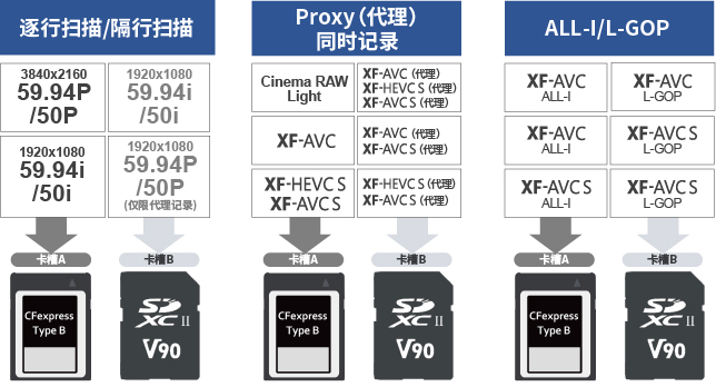 EOS C50的双卡槽支持以多种不同的格式组合在2张卡上进行记录。以文件格式、分辨率和颜色采样等各不相同的流组合同步记录。可根据备份或发送等目的区分使用,减少转换操作所需时间与精力,使拍摄效率大大提高。