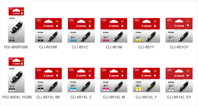 | 大容量 | CLI-851XL BK:1125页;CLI-851XL C:366页;CLI-851XL M:366页;CLI-851XL Y:366页;CLI-851XL GY:275页 | ||