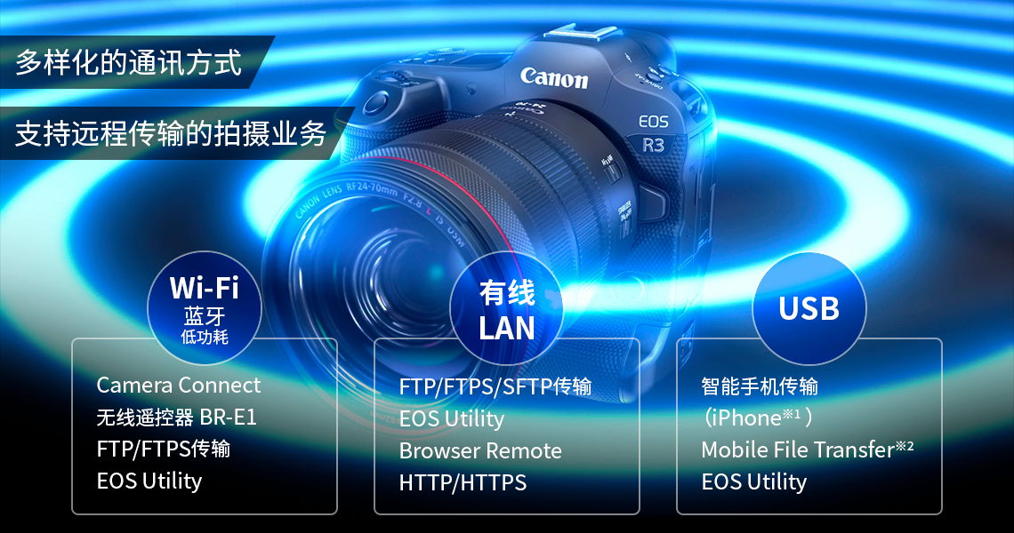 EOS R3内置2.4GHz/5GHz频段的Wi-Fi通讯功能,支持IEEE 802.11b/g/n/a/ac的规格。除了可通过智能手机应用程序Canon Camera Connect连接智能手机进行图像传输,还支持FTP等业务级图像传输。在EOS R 相机系列中首次支持1000BASE-T以太网端子,可实现高速有线传输。通过USB Type-C 端子(USB 3.2 Gen 2)可连接FTP,或通过EOS Utility 实现文件高速传输及遥控拍摄。