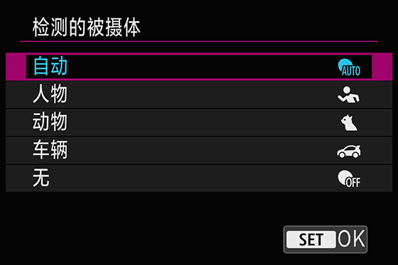 EOS R6 Mark III可设置想要检测的被摄体类别,可设置的类别有人物、动物、车辆,还可选择“自动”,即同时检测这3种被摄体。选择自动后,相机可自动检测画面中的人物、动物及车辆,如果检测出多个被摄体,可根据被摄体的种类及构图自动选择合适的主被摄体。