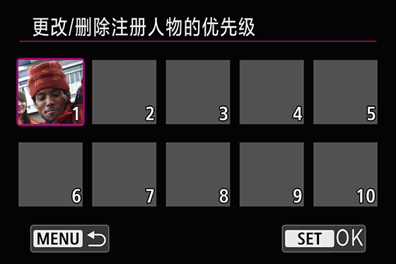 ※1 相机内可注册10个人物并作为一个文件保存到存储卡。存储卡可保存10个注册文件,所以最多可注册100个人物。(实际可识别的是相机内注册的最多10人)