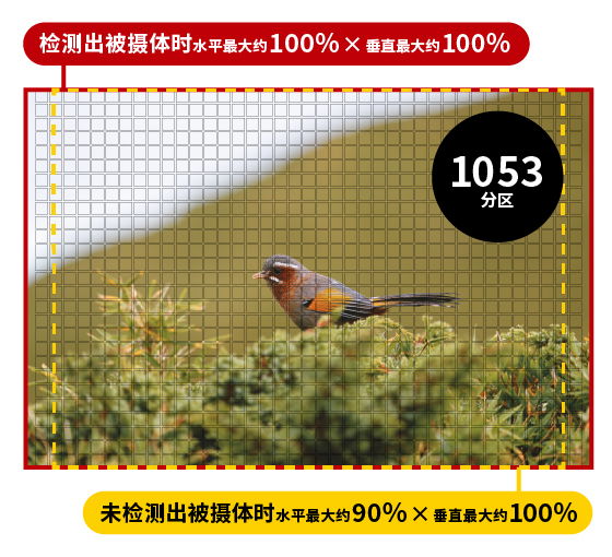 ※ 安装使用的镜头支持90%×100%(水平×垂直)的对焦范围,使用整个区域自动对焦或使用其他自动对焦区域模式检测出被摄体时。根据场景及被摄体状态,自动对焦点可能无法移动到自动对焦区域的边缘。