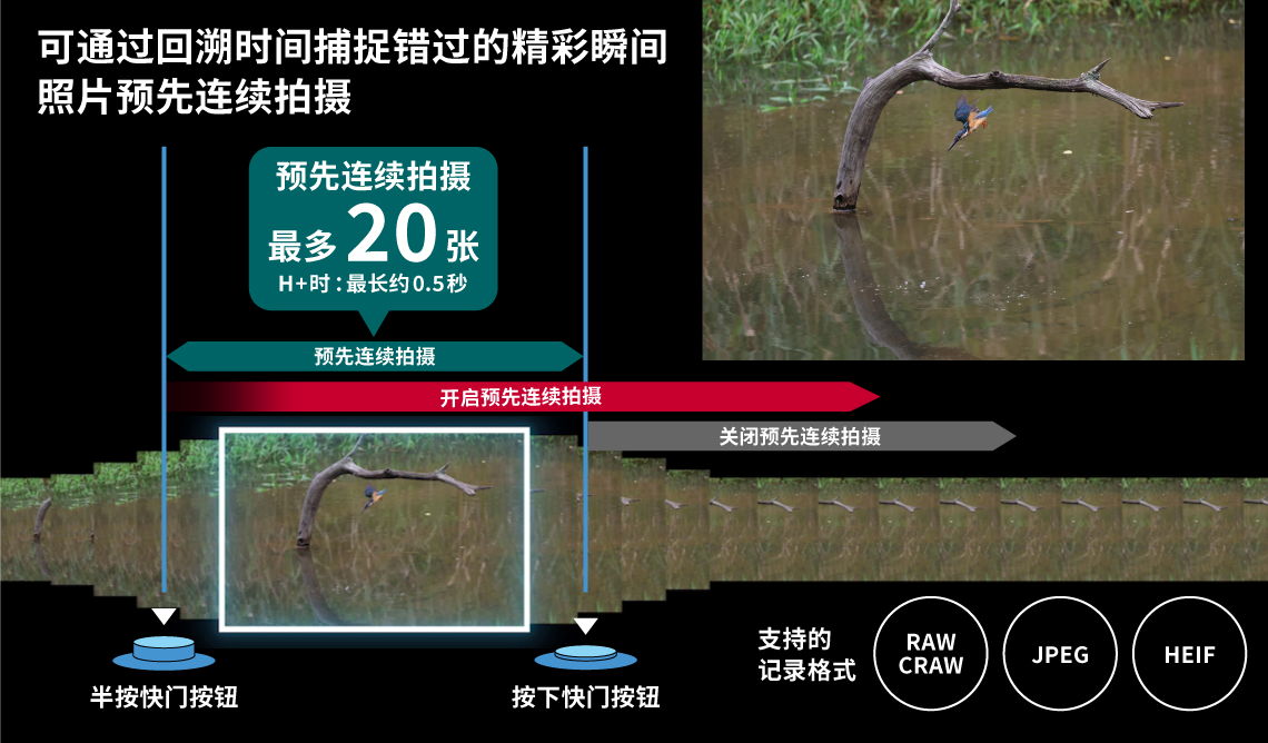 使用预先连续拍摄功能,电子快门下可记录下按下快门按钮之前最多20张连拍照片。由此,原先只能拍摄者凭感觉或经验拍摄的高难度场景,也能减少错过时机的拍摄失败,拍摄更放心。预先连续拍摄支持RAW / C-RAW / JPEG / HEIF格式图像,且不用RAW连拍模式那样拍摄后再提取照片。