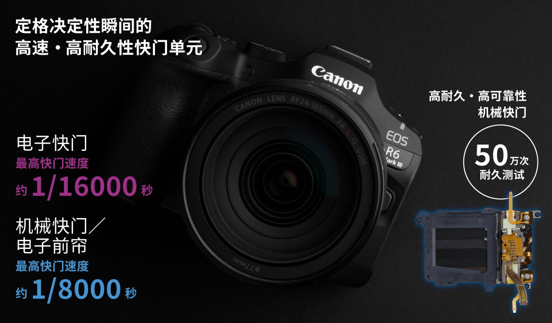 EOS R6 Mark III具备机械快门,且连拍速度最高约12张/秒。最高快门速度约1/8000秒。且快门单元在佳能内部测试中通过了约50万次的耐久测试,具备高耐久性。电子快门下的快门速度最高达到约1/16000秒。在日光强烈的室外用大光圈拍摄人像、或想定格飞溅的水花等人眼很难捕捉的瞬间时,高速快门可以发挥作用。