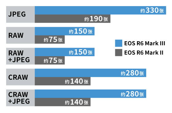 ※ 佳能测试标准。使用325GB CFexpress卡、128GB UHS-II规格SD卡时的张数。