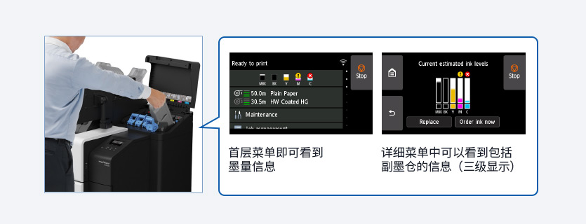 在SmartWorks软件中可检测打印信息,并对打印机进行管理,例如墨水余量查看、纸张余量查看以及打印机维护。