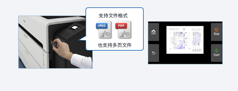 节U盘插入打印机后,PDF和JPEG格式的文件可以识别并进行直接打印;