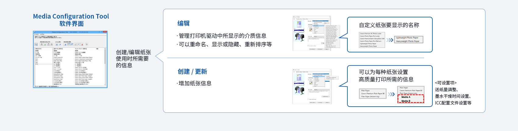通过配置工具,可以对操作面板和驱动程序中显示的纸张类型信息进行重命名、排序等设置;也可以根据使用需求,自定义添加新的纸张信息。