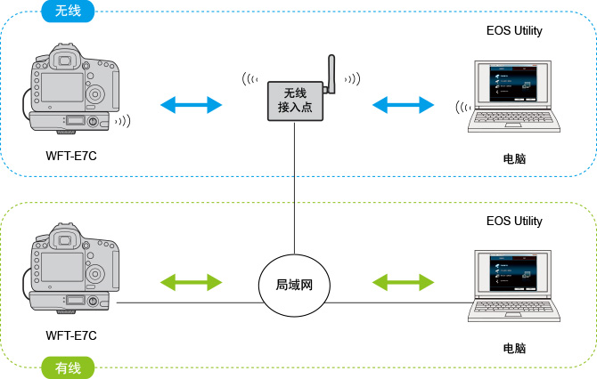 WFT-E7C的图像文件传输系统兼可支持无线与有线局域网。其中无线局域网标准为IEEE802.11a/b/g/n,最大传输速度约为150Mbps。有线局域网标准为1000BASE-T,最大传输速度可达约1Gbps。借助网络,遥控拍摄也可无时滞地流畅操作,且拍摄后可快速传输图像文件,有效提高了拍摄流程的效率。