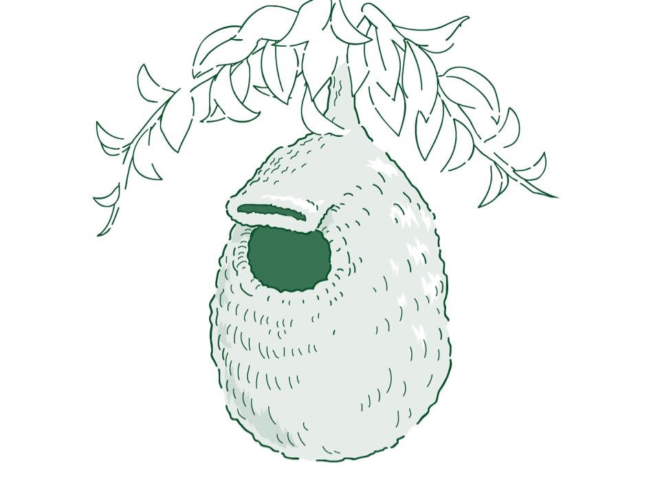 还有些鸟类掌握着“缝纫”技艺。生活在热带地区的缝叶莺、棕扇尾莺等鸟类,会用喙将树叶巧妙地缝合起来筑巢。日本的棕扇尾莺会在芒草的叶子上纵向扎出多个小孔,然后交替穿过蜘蛛网,将多片叶子缝合在一起。巢的外侧会塞满芒草白色的花穗,看起来就像草丛中放置着一个白色的瓦罐,十分美丽。攀雀在日本不繁殖,但它们会筑出和银喉长尾山雀相似的温暖悬挂巢。酋长鸟的巢呈瓦罐状,入口朝下,织布鸟的巢则是用草叶精心编织而成的艺术品。