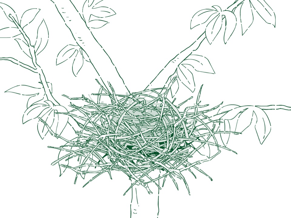 乌鸦类、鹭类、鹰类等中型鸟类,会用树枝筑巢。它们的巢大多是在树上堆积树枝形成的盘状巢,但喜鹊的巢有些特别。喜鹊会收集大量树枝,在树木或电线杆上筑成直径约50厘米的大型球状巢。产卵区(孵卵的地方)位于巢的深处,因此无法看到巢的内部。生活在非洲的锤头鹳,全身呈棕色,体型和小白鹭差不多,但巢却十分巨大。锤头鹳的巢是用树枝堆积而成,直径可达3米,就像喜鹊巢的放大版。