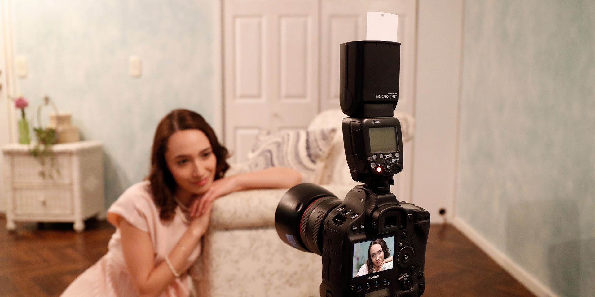 点击此处查看室内人像拍摄技巧有时在室内使用闪光灯正面闪光拍摄,会产生不自然的阴影。利用跳闪拍摄,可有效缓解不自然阴影的产生。跳闪时,闪光灯发出的光线会经由天花板或墙壁反射扩散,提亮周围环境的同时,到达被摄体的光线也变得更加柔和,从而获得亮度柔和自然的照片效果。