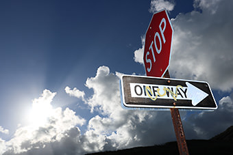 以天空为背景,从下面进行仰拍。降低背景的曝光量,闪光灯的光线使标志牌在画面中凸显出来。