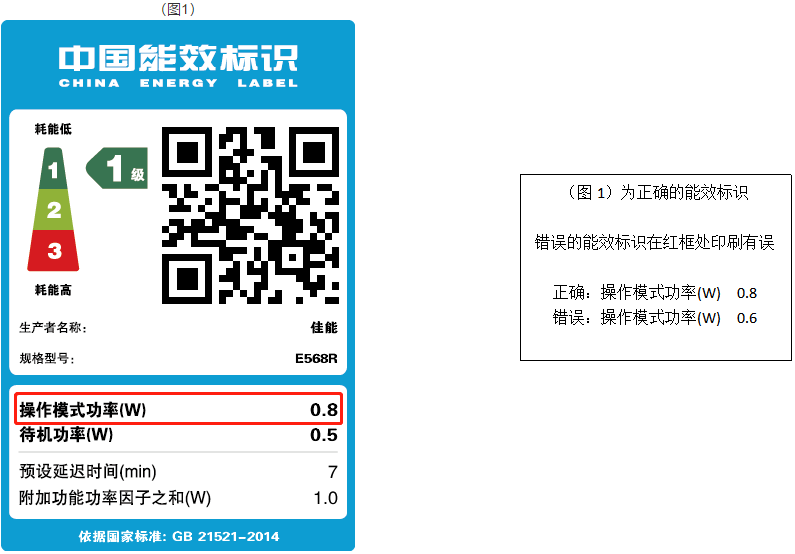 产品外包装上张贴的「能效标识」印刷有误,正确的「能效标识」详见图1。