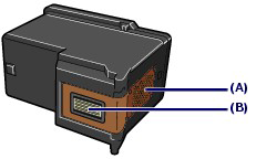 - 请勿触摸墨盒(FINE Cartridge)上的电气触点(A)或打印头喷嘴(B)。 如果触摸此区域,本机可能无法正确打印。