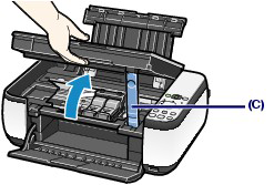 - 如果扫描单元(机盖)打开,墨盒(FINE Cartridge)支架会移至右侧。 在这种情况下,关闭并重新打开扫描单元(机盖)。