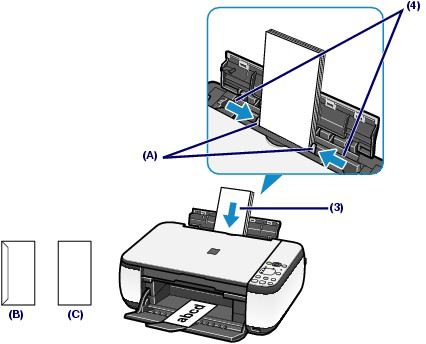 (3) 滑动纸张导片(A)以将其打开,并在后端托盘的中心以地址面朝向自己装入信封。