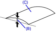 根据介质类型,即使纸张未向内卷曲也可能出现污迹或无法正确送入。 在这种情况下,打印前请按照以下描述的步骤向外卷曲纸张,并且高度在0.1英寸/3毫米(B)以内。 这可能会改善打印效果。