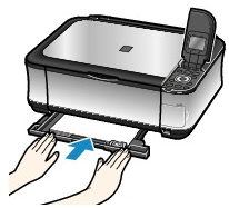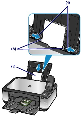 (3) 滑动纸张导片(A)以将其打开,并在后端托盘的中心以打印面朝向自己装入纸张。