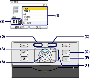 (3) 按彩色按钮(F)进行彩色复印,或按黑白按钮(G)进行黑白复印。