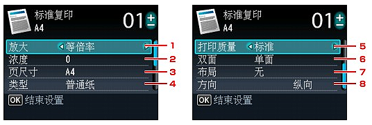 - 根据设置项,某些设置无法和其他设置项或复印菜单的设置组合指定。 如果选择了不能组合指定的设置,液晶显示屏上会显示错误详细信息。 在这种情况下,触摸左功能按钮确认信息,然后更改设置。