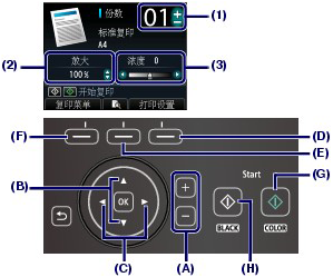 - 复印稿台玻璃上的原稿时触摸中间的功能按钮(E),可以查看打印结果的预览。