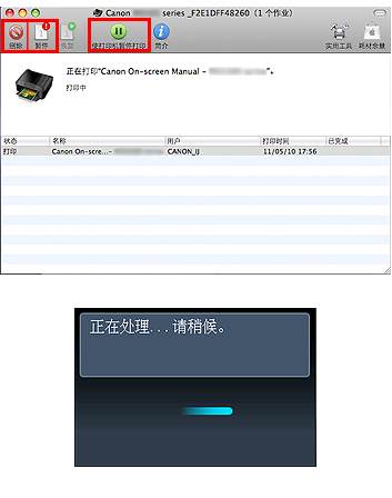 删除打印作业后,打印机端仍显示 "正在处理..." 信息。(Macintosh)