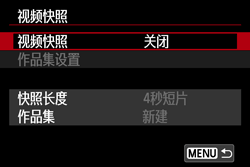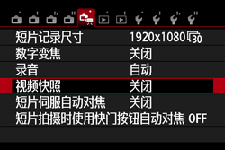 12. 将 [视频快照] 设为 [关闭]。按下 <MENU> 按钮可退出菜单并且返回到常规短片拍摄。