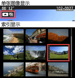 - 在索引显示过程中,图像左边缘的孔眼表示此为视频快照作品集。由于无法在索引显示中播放视频快照作品集,因此请按下 <
