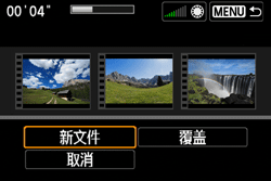 出现保存屏幕。在创建新文件时,选择 [新文件];并且在您不想留下未经编辑的短片时,选择 [覆盖],然后按 <