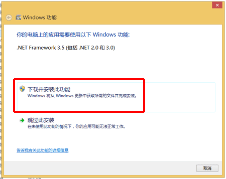 1. 在显示 [Windows 功能] 屏幕后,单击 [下载并安装此功能]。