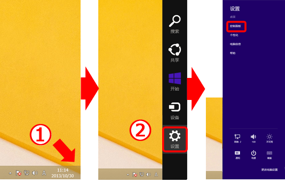 将指针移向屏幕的右下角。在显示超级按钮时,向上移动指针以便选择 [设置]。然后,选择 [控制面板]。