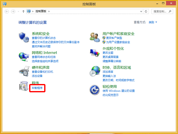 2. 在 [控制面板] 屏幕上单击 [卸载程序]。