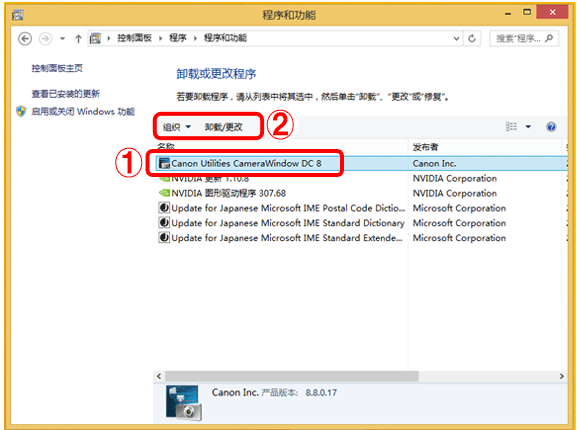 3. 选择 [Canon Utilities CameraWindow DC8],然后单击 [卸载/更改]。