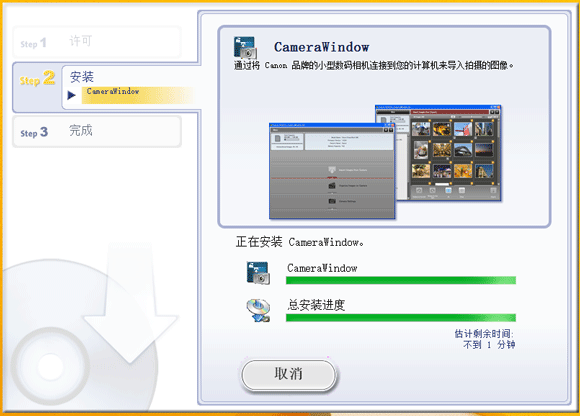 ] 图标,或者单击 [取消] 按钮以关闭该窗口,.NET Framework 3.5 将不会安装。但在您下次启动 CameraWindow 时,上面所示的屏幕将再次显示。