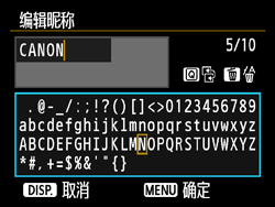 | 输入文本 | 在底部区域中,按 < > 十字键选择或者转动 < > 转盘选择字符,然后按 < > 将其输入。通过参阅屏幕右上方的“*/*”,可以查看已经输入了多少字符,以及可以继续输入多少字符。 |