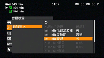 依次选择 [音频设置] -> [音频输入] -> [Int.Mic 衰减]。