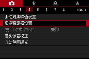 - 对于除 EF-M 以外的镜头,不会显示 [影像稳定器模式]。请改为使用镜头上的影像稳定器开关。