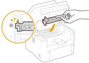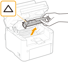 - 请勿摇晃或倾斜墨粉盒。此外,请确保不要震动墨粉盒,如将墨粉盒碰到某些物体等。这样做可能导致墨粉盒中剩余的墨粉泄漏。以与插槽相同的角度轻轻取出墨粉盒。