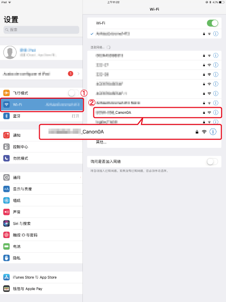 22. 在 iPad 上打开 [ 设置 ],选择 [ Wi-Fi ] 以便确认 SSID 与在相机屏幕上显示的相同,然后点击以选择。